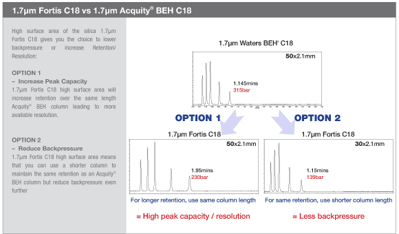 The high surface area of 1.7µ Fortis UHPLC columns gives you the choice to lower backpressure or increase retention and resolution.