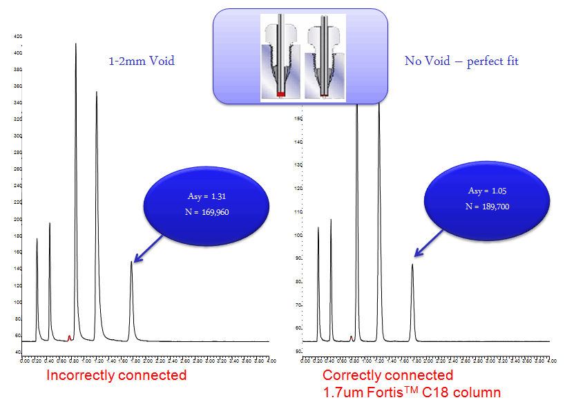 To ensure that no problems occur when UHPLC columns are fitted into the UPLC system, the need for an adjustable fitting is necessary. By using an adjustable fitting you can ensure that there is a correct fitting with no added "dead volume" to the system which would compromise the performance of the small particles.